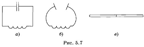 Дело в том, что его переменное электрическое поле сосредоточено преимущественно в очень малой области пространства между обкладками конденсатора, а магнитное — внутри катушки. Чтобы излучение электромагнитных волн было достаточно интенсивным, область переменного электромагнитного поля должна быть велика и не огорожена металлическими пластинами. Здесь имеется сходство с излучением звуковых волн. Колеблющаяся струна или камертон без резонаторного ящика почти не излучают, так как в этом случае колебания воздуха возбуждаются в очень малой области пространства, непосредственно примыкающей к струне или ветвям камертона. Область, в которой создается переменное электрическое поле, увеличивается, если раздвигать пластины конденсатора. Емкость при этом уменьшается. Одновременное уменьшение площади пластин еще больше уменьшит емкость (рис. 5.7, б). Уменьшение же емкости увеличит собственную частоту этого колебательного контура. Для еще большего увеличения частоты нужно заменить катушку прямым проводом без витков. Индуктивность прямого провода гораздо меньше индуктивности катушки. Продолжая раздвигать пластины и уменьшая одновременно их размеры, мы придем к открытому колебательному контуру. Это просто прямой провод (рис. 5.7, в). В открытом контуре заряды не сосредоточены на концах, а распределены по всему проводнику. Ток в данный момент времени во всех сечениях проводника направлен в одну и ту же сторону, но сила тока не одинакова в различных сечениях проводника. На концах она равна нулю, а посредине достигает максимума. (Напомним, что в обычных цепях переменного тока сила тока во всех сечениях в данный момент времени одинакова.)