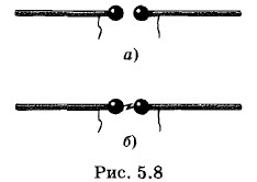 Для возбуждения колебаний в таком контуре нужно провод разрезать посредине так, чтобы остался небольшой воздушный промежуток, называемый искровым (рис. 5.8, а). Благодаря этому промежутку можно зарядить оба проводника до высокой разности потенциалов. Когда разность потенциалов превысит некоторое предельное значение, проскакивает искра, цепь замыкается и в открытом контуре возникают колебания (рис. 5.8, б). Из-за малой емкости и индуктивности частота колебаний очень велика. Колебания, разумеется, будут затухающими по двум причинам: во-первых, вследствие наличия у вибратора активного сопротивления, которое особенно велико в искровом промежутке; во-вторых, из-за того, что вибратор излучает электромагнитные волны и теряет при этом энергию. После того как колебания прекратятся, источник вновь заряжает оба проводника до наступления пробоя искрового промежутка и все повторяется сначала (рис. 5.9).
