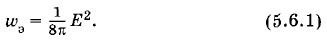 Глава 5. Электромагнитные волны § 5.6. Энергия электромагнитной волныПлотность энергии излученияФормулы (5.5.4) и (5.5.5) для модулей Е и В* позволяют определить плотность энергии электромагнитного излучения. * Мы не ставим индекс «в» у векторов Плотность энергии электрического поля в системе Гаусса равна (в вакууме):