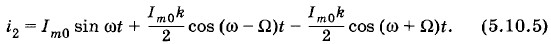 Глубина модуляции определяется амплитудой колебаний силы тока в цепи модулятора. Изменение силы тока в контуре генератора с течением времени в соответствии с выражением (5.10.2) запишется так: i2 = Im0(1 + k sin Ωt) sin ω. (5.10.4) Так как частота модуляции Ω << ω, то амплитудно-модули- рованные колебания можно приближенно рассматривать как гармонические колебания с периодически медленно меняющейся амплитудой (рис. 5.27, в). Временну́ю развертку модулированных колебаний можно наблюдать на экране осциллографа, если подать на него напряжение с контура генератора. Частотный спектр модулированных колебанийОчень существенно, что при модуляции меняется частотный спектр колебаний. Модулированные колебания — это не просто наложение гармонических колебаний с различными частотами ω и Ω. Сейчас мы это увидим. Вспомним известную из тригонометрии формулу для произведения синусов:
