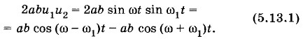 Блок-схема супергетеродинного приемника изображена на рисунке 5.38. В супергетеродинном приемнике принятые антенной высокочастотные модулированные колебания усиливаются и вместе с колебаниями, вырабатываемыми гетеродином, поступают в особое устройство — смеситель, в котором происходит преобразование частот. С этой целью высокочастотное модулированное напряжение u1(t) подается на базу транзистора, а напряжение u2(t) гетеродина — на эмиттер. Сила тока в цепи коллектора оказывается зависящей от этих двух напряжений. Если бы вольт-амперная характеристика транзистора была линейной, то сила тока на выходе (в цепи коллектора) представляла бы простую сумму двух сил токов различных частот: i ≈ аu1 + bu2. Преобразование (изменение) частоты основано на нелинейности характеристики транзистора. Вольт-амперная характеристика транзистора (смесителя) содержит наряду с линейным членом еще и квадратичный член i ≈ (аu1 + bu2)2. Преобразование частот осуществляется за счет члена