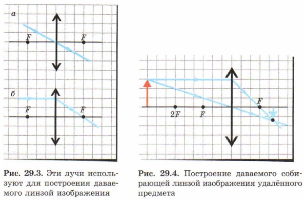 В качестве модели предмета возьмем стрелку, перпендикулярную главной оптической оси. На рис. 29.4 показано, как с помощью указанных лучей построить даваемое линзой изображение удалённого предмета, а на рис. 29.5 — изображение предмета, расположенного немного дальше фокусного расстояния линзы.