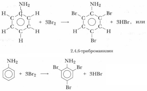Реакция взаимодействия анилина с бромной водой протекает так же, как у фенола, т. е. следующим образом:
