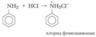 3. В связи с ослаблением основных свойств аминогруппы под влиянием бензольного кольца анилин не способен взаимодействовать с водой, но взаимодействует с кислотами, образуя соли: