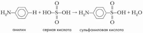 Если на раствор образовавшейся соли подействовать щелочью, вновь образуется анилин. Особенность этой кислоты заключена в том, что в ее составе находятся две функциональные группы с противоположными свойствами. Но поскольку аминогруппа обладает слабыми основными свойствами, а сульфогруппа (остаток серной кислоты) — сильными, в полученном соединении преобладают кислотные свойства. Сульфаниловая кислота — важный промежуточный продукт в синтезе красителей и лекарственных препаратов (сульфаниламидные препараты). К сульфаниламидным препаратам относятся стрептоцид, норсульфазол, этазол и др. Они используются для лечения воспаления легких, гнойных и других заболеваний.